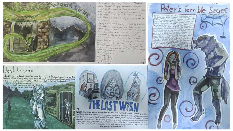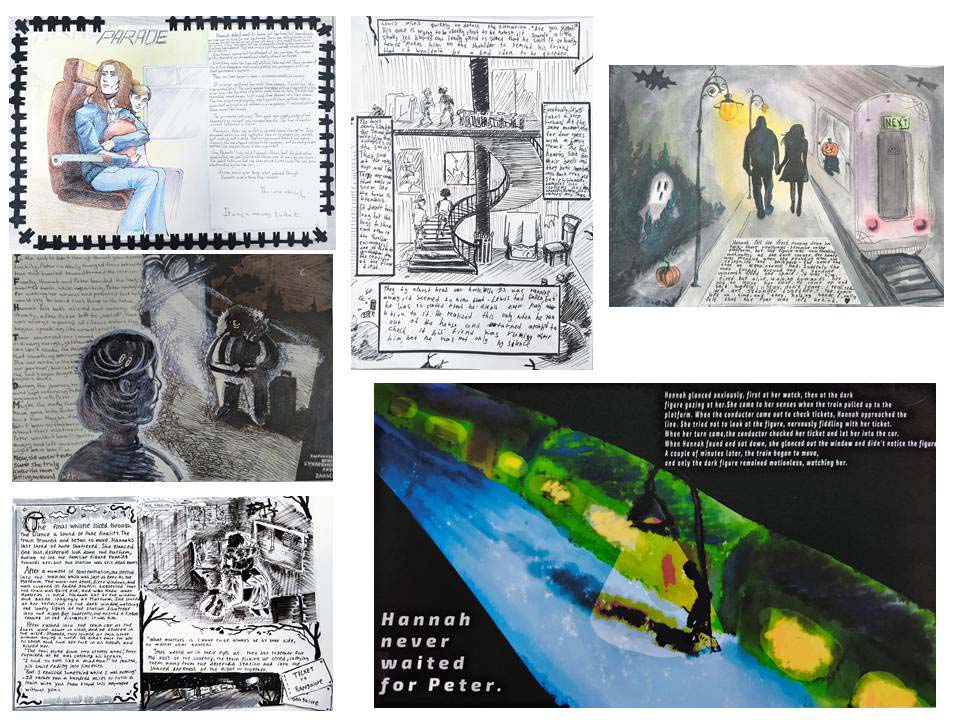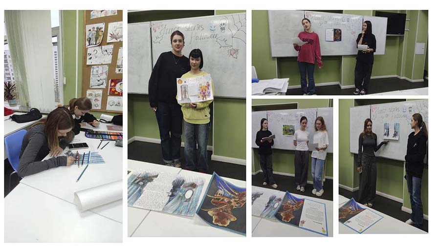 1) Во время урока-конкурса иллюстраций студенты погрузились в атмосферу таинственных историй и фольклорных сюжетов, связанных с Хэллоуином. Под руководством Диланян Гаяне Меружановны и Агафоновой Ирины Анатольевны участники создавали оригинальные иллюстрации к мистическим рассказам и легендам, раскрывая собственное художественное видение праздника. Работы отличались индивидуальностью и богатством фантазии: среди них были и добродушные персонажи, и сказочные пейзажи, и загадочные сцены с элементами мистики. Лучшие иллюстрации украсили выставку, став центральным элементом праздничного оформления.