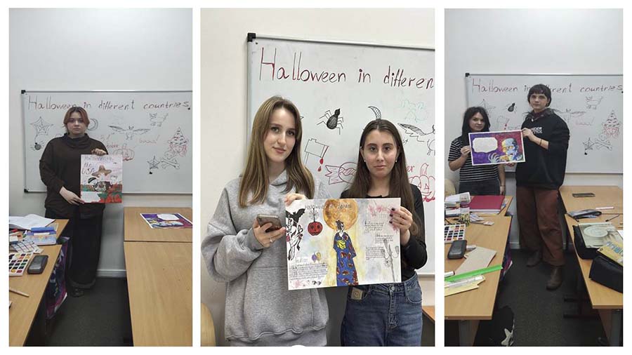 2) Отдельным событием стал тематический урок-конкурс плакатов, посвящённый традициям и символике Хэллоуина в мире. Студенты исследовали, как отмечают этот праздник в разных странах — от старинных костюмированных шествий в Ирландии и Великобритании до красочных парадов и уличных фестивалей в США, Японии и Мексике.