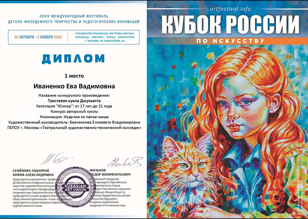 С 28 апреля по 10 мая 2025 года прошёл XXXIX Международный фестиваль детско-молодёжного творчества и педагогических инноваций «Кубок России по художественному творчеству». В выставке-конкурсе фестиваля приняли активное участие и стали победителями студенты 1, 2, 3 и 4 курса Художественно-бутафорского отделения. В конкурсе Авторской куклы 1 место заняли студентки Калюжнюк Ксения, Прибылова Анна, Колесникова Ульяна, 2 и 3 место заняла Шишкина Виктория. В конкурсе Авторской игрушки 1 место заняла студентка Кучина Элеонора. В конкурсе декоративно-прикладного искусства 1 место заняли студенты Калюжнюк Ксения, Лесничий Никита, Павлюков Егор, 3 место заняли Иваненко Ева и Савельева Кира. В этом конкурсе приняла также участие Потапова Софья. В конкурсе Декоративной живописи 1 место заняла Каструба Полина, 2 место заняли Кучина Элеонора и Фролова Полина. Работы, представленные студентами на конкурс, были выполнены под руководством преподавателей Токаревой Ксении Евгеньевны, Бавченковой Елизаветы Владимировны, Хилова Игоря Анатольевича, Придыры Елены Викторовны. Поздравляем студентов и преподавателей и желаем всем дальнейших успехов!