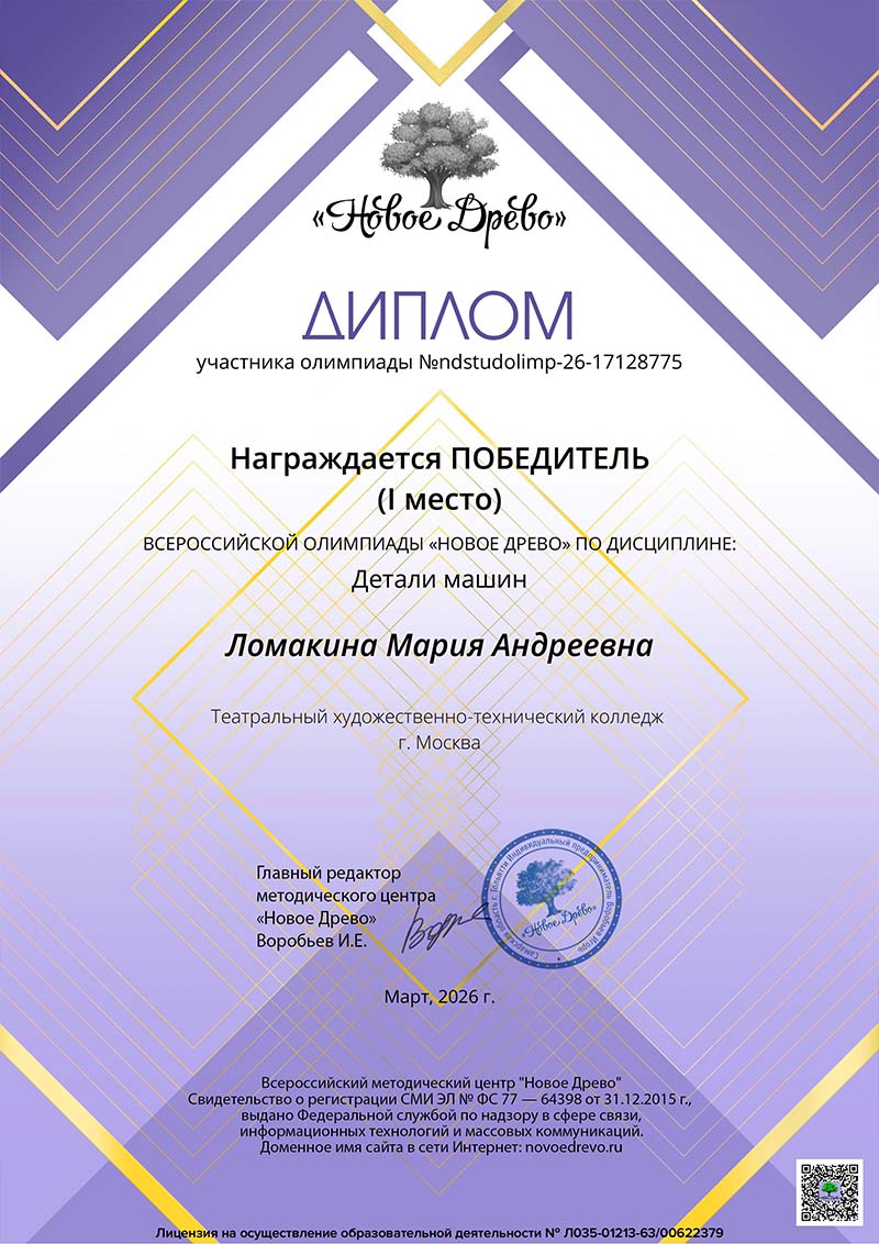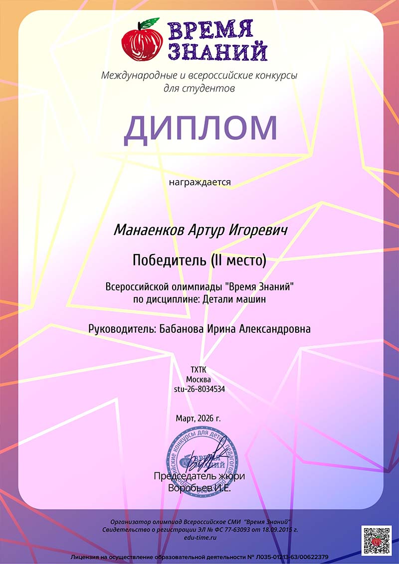 3 марта 2026 года студенты группы 3ОС под руководством преподавателя отделения Бабановой И.А. приняли участие во Всероссийской олимпиаде «Время знаний» по дисциплине «Детали машин». Студенты показали достойные знания по одному из ведущих предметов специальности и заняли призовые места.