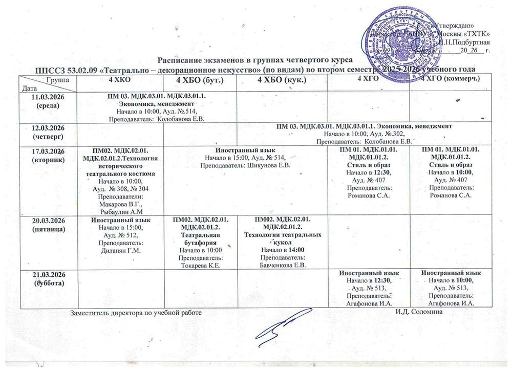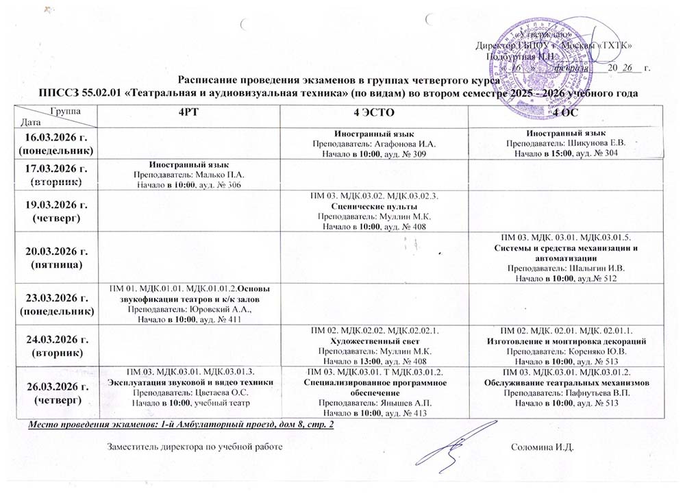 Расписание экзаменациооных просмотров и экзаменов во II полугодии 2025-2026 учебного года в руппах: 4Реклама