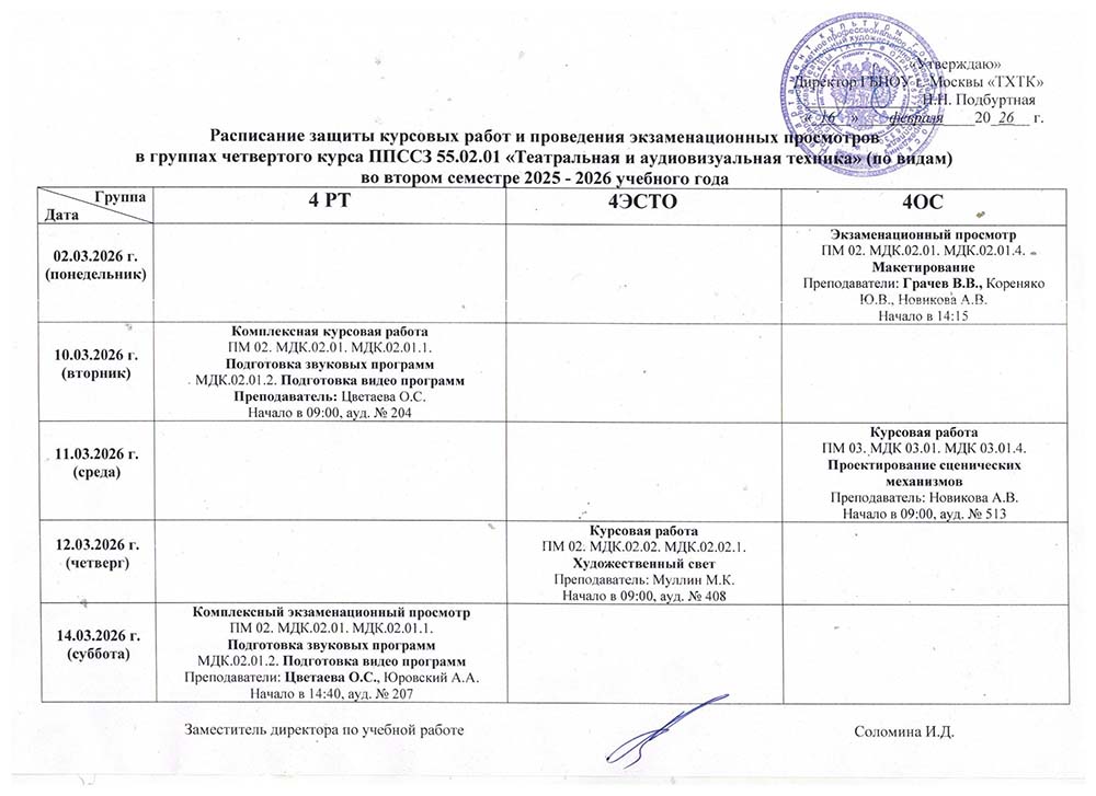Расписание защиты курсовых работ и экзаменациооных просмотров во II полугодии 2025-2026 учебного года в руппах: 4РТ, 4ЭСТО, 4ОС
