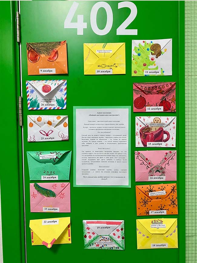 10 декабря 2025 года педагог-психолог Лапина Е.А. разместила в колледже адвент-календарь, содержащий в себе психолого-ориентированные заданий для подготовки к Новому году! Данный календарь направлен на развитие эмоциональной устойчивости, создание позитивного настроя и поддержку обучающихся в предновогодний период. Ежедневные задания помогают ребятам постепенно включаться в праздничную атмосферу, совмещая элементы психологической практики с творческими и мотивирующими активностями. Календарь способствует формированию чувства общности, укреплению благоприятного психологического климата и созданию уютной праздничной атмосферы в колледже.