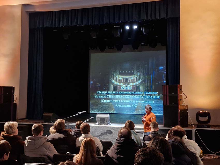 Преподаватель Мельникова Е.Г. и студенты специальности «Техника и технологии аудиовизуальных программ» показали ролики и выпускные работы. Преподаватель по специальности «Сценическая техника и технологии» Шахверанов Р.А. ознакомил абитуриентов, поступающих на технические специальности с оборудованием учебного театра, где наши студенты выполняют практические задания. Особенный интерес у абитуриентов и их родителей вызвала презентация зав. ПЦК Горелова М.Д. по специальности «Светорежиссура».