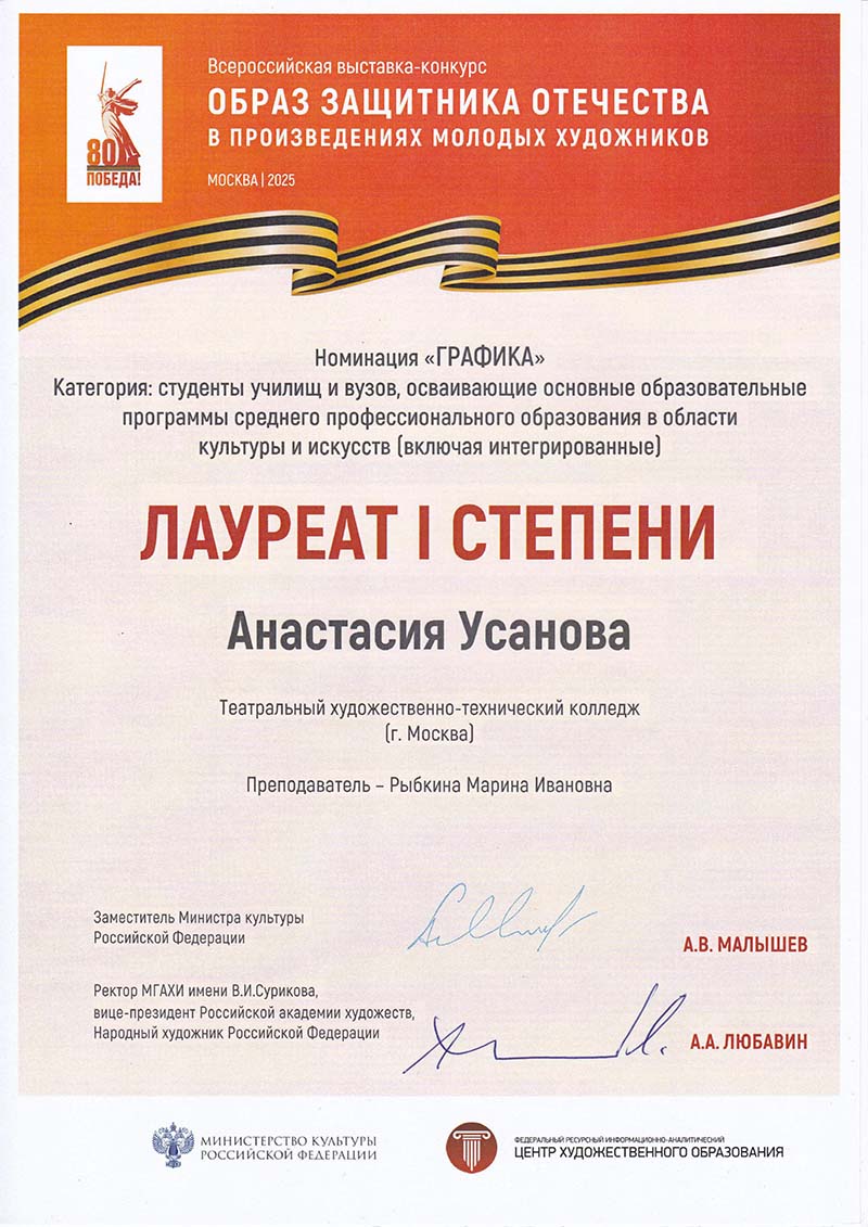 Поздравляем Победителя - Лауреата 1 степени Всероссийской выставки-конкурса «Образ защитника Отечества в произведениях молодых художников» в номинации «Графика» студентку ГБПОУ г. Москвы «ТХТК» - выпускницу 2025 года Анастасию Усанову и ее преподавателя Рыбкину Марину Ивановну! Победитель конкурса Анастасия Усанова удостоена чести получить диплом за подписями заместителя Министра культуры РФ А.В. Малышева и ректора МГАХИ им. В.И. Сурикова, вице-президента Российской академии художеств, народного художника РФ А.А. Любавина. Желаем дальнейших успехов и творческого развития!