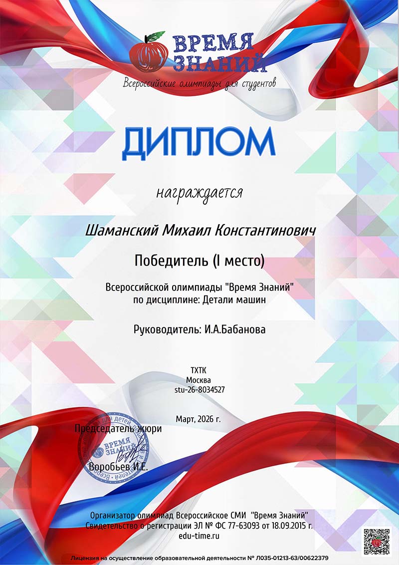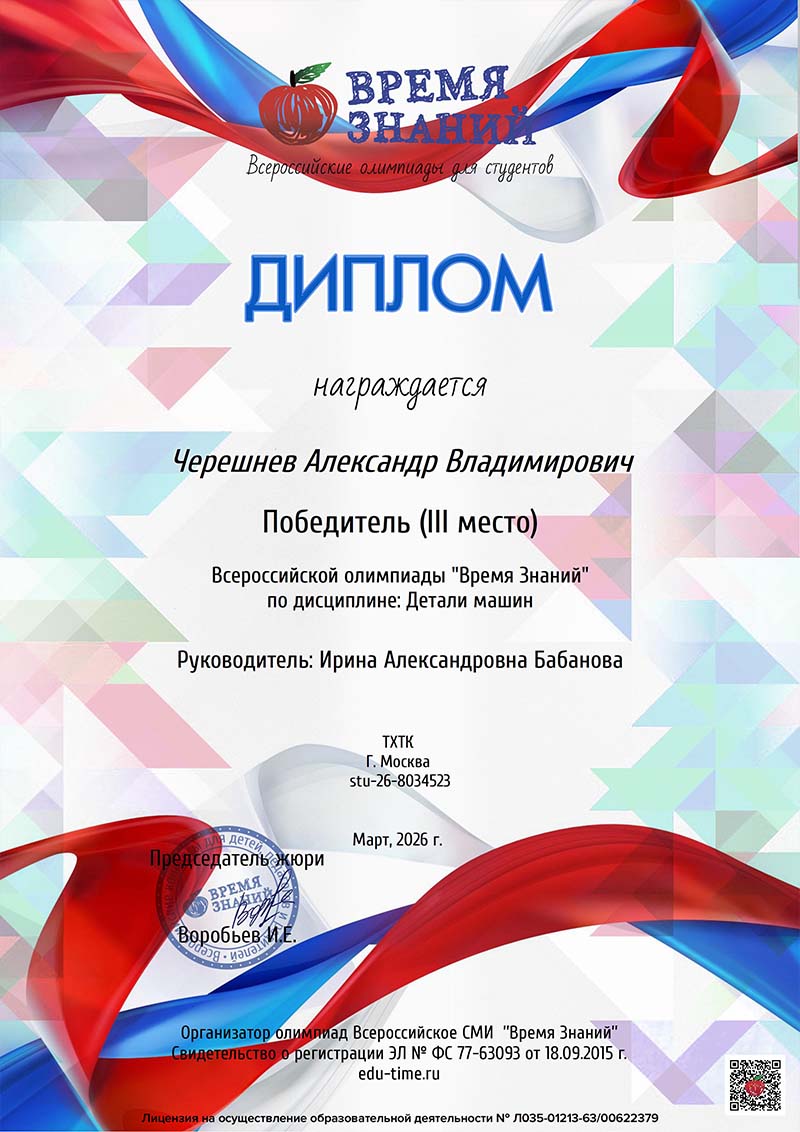 3 марта 2026 года студенты группы 3ОС под руководством преподавателя отделения Бабановой И.А. приняли участие во Всероссийской олимпиаде «Время знаний» по дисциплине «Детали машин». Студенты показали достойные знания по одному из ведущих предметов специальности и заняли призовые места.