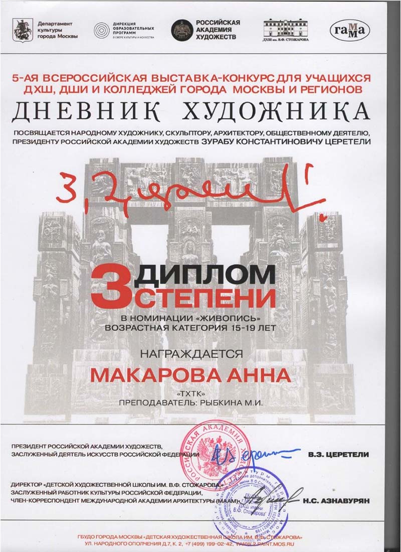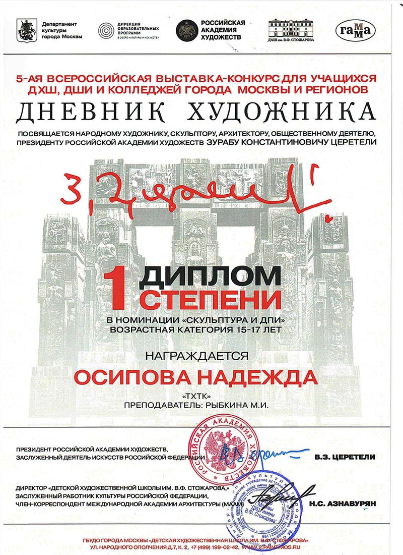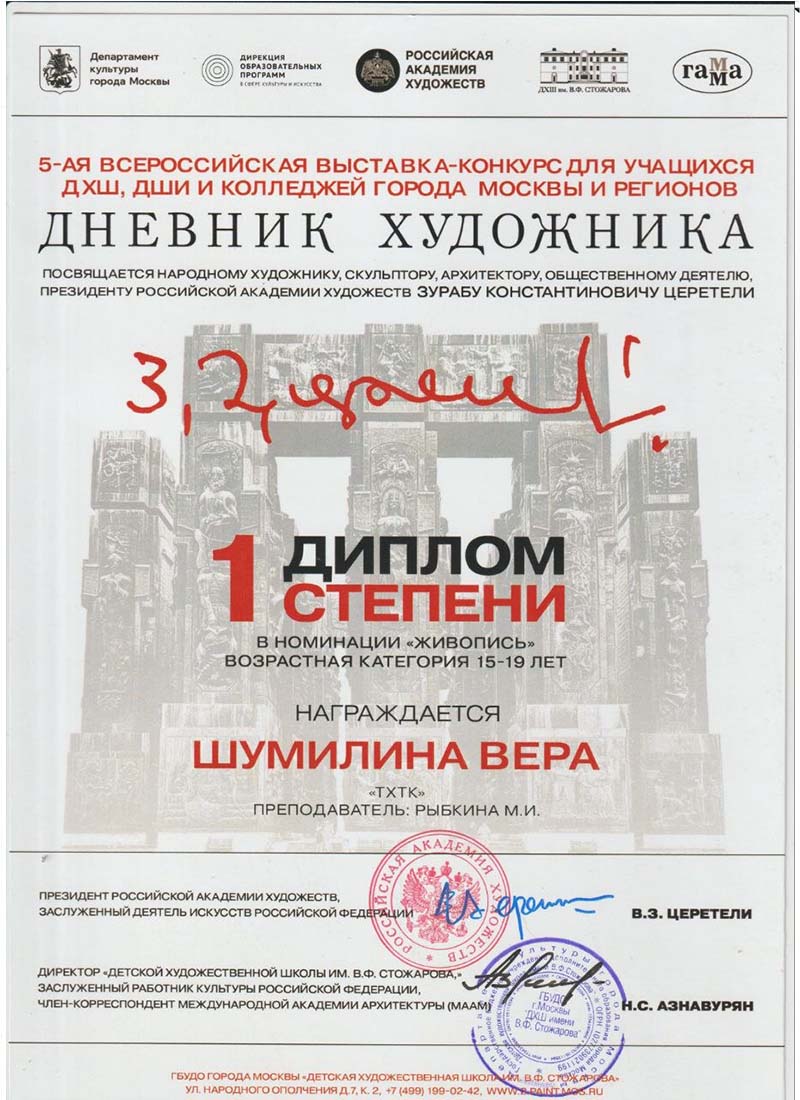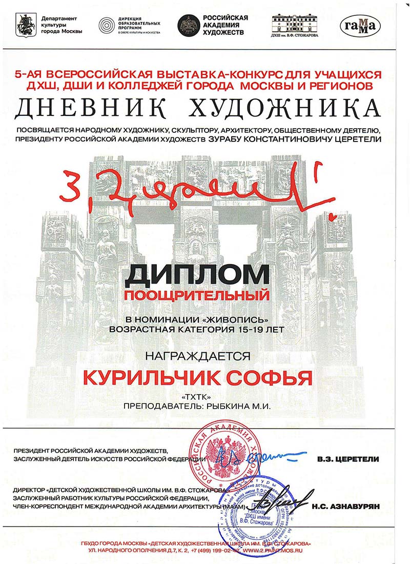 14 апреля 2026 года в Музейно-выставочном комплексе Российской Академии Художеств Галерее искусств Зураба Церетели награждение победителей V Всероссийской выставки-конкурса для учащихся ДХШ, ДШИ и колледжей города Москвы и регионов «Дневник художника», посвященная народному художнику, скульптору, архитектору, Президенту Российской Академии Художеств Зурабу Константиновичу Церетели. Поздравляем Победителей конкурса - студентов ГБПОУ г. Москвы «ТХТК»: Надежду Осипову (Дипломант 1 и 3 степени), Веру Шумилину (Дипломант 1 степени), Анну Макарову (Дипломант 3 степени) и Софью Курильчик (поощрительный диплом)! Выражаем благодарность преподавателю колледжа Рыбкиной Марине Ивановне за. отличную подготовку студентов к конкурсу! Желаем новых Побед!
