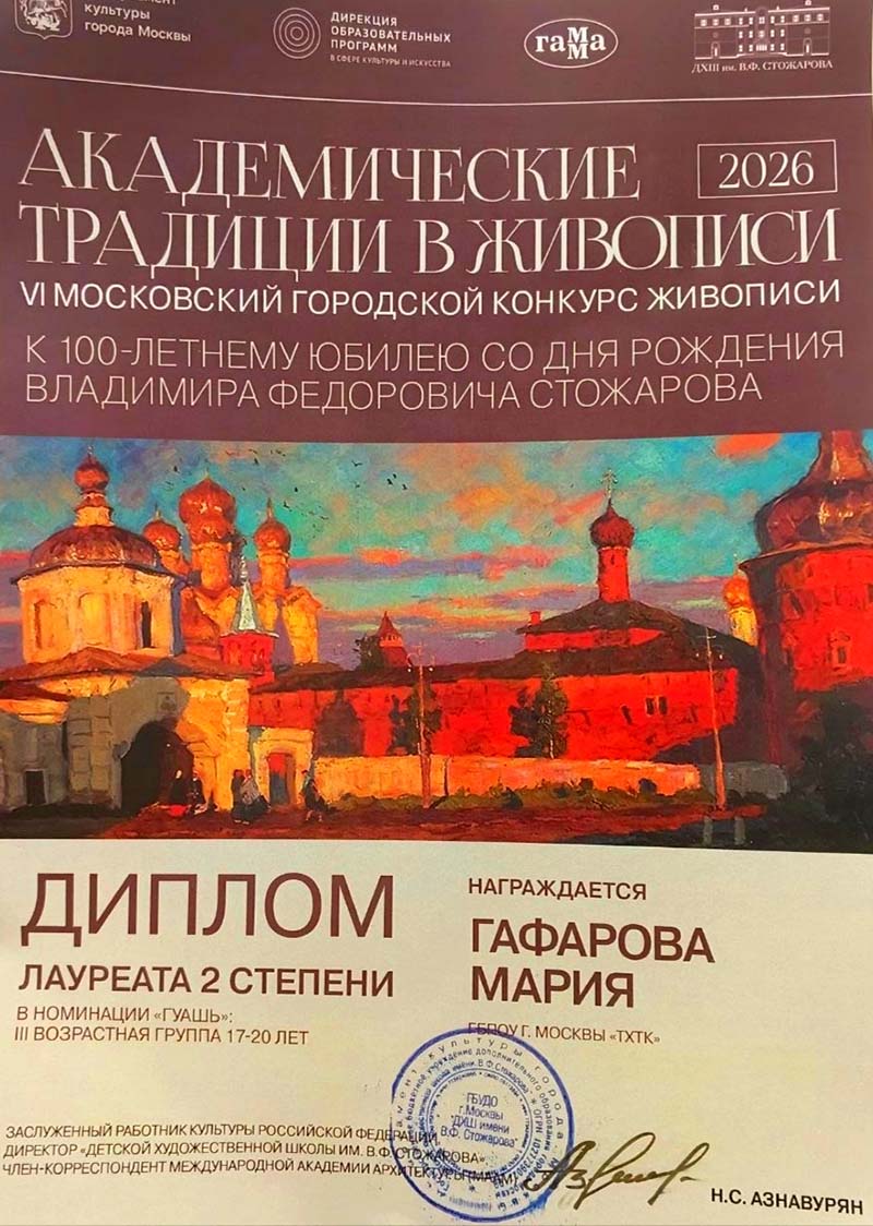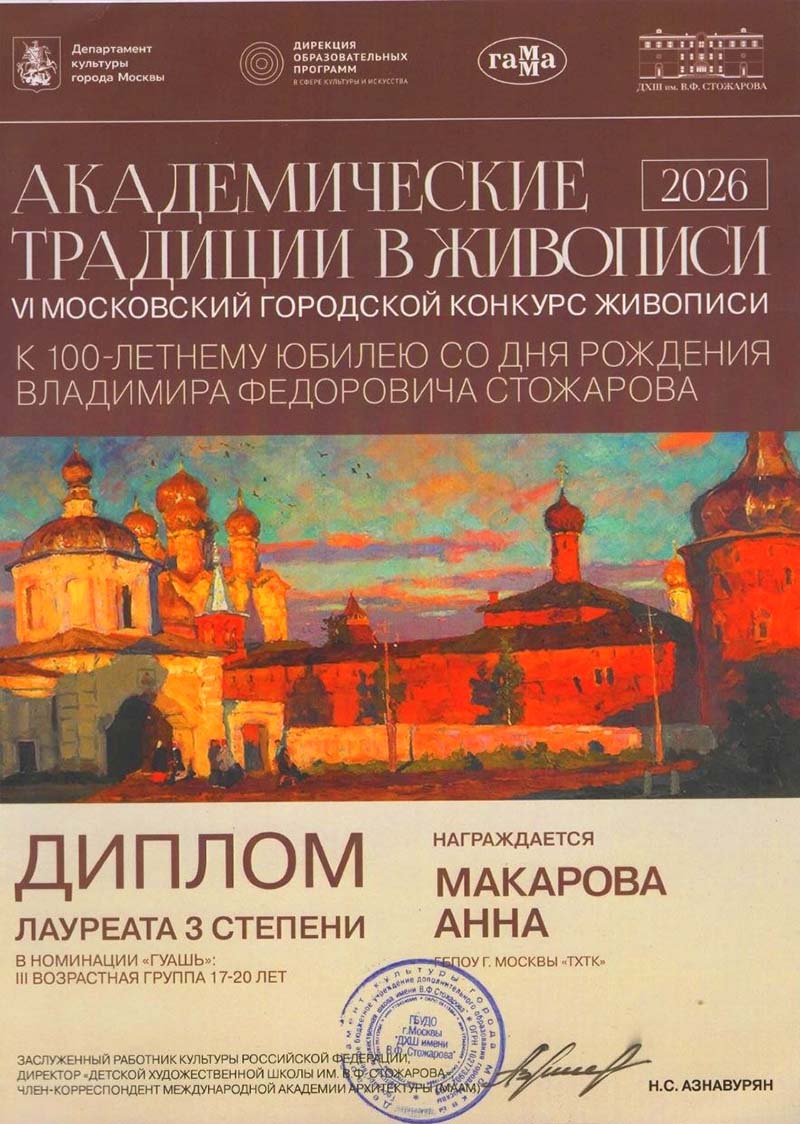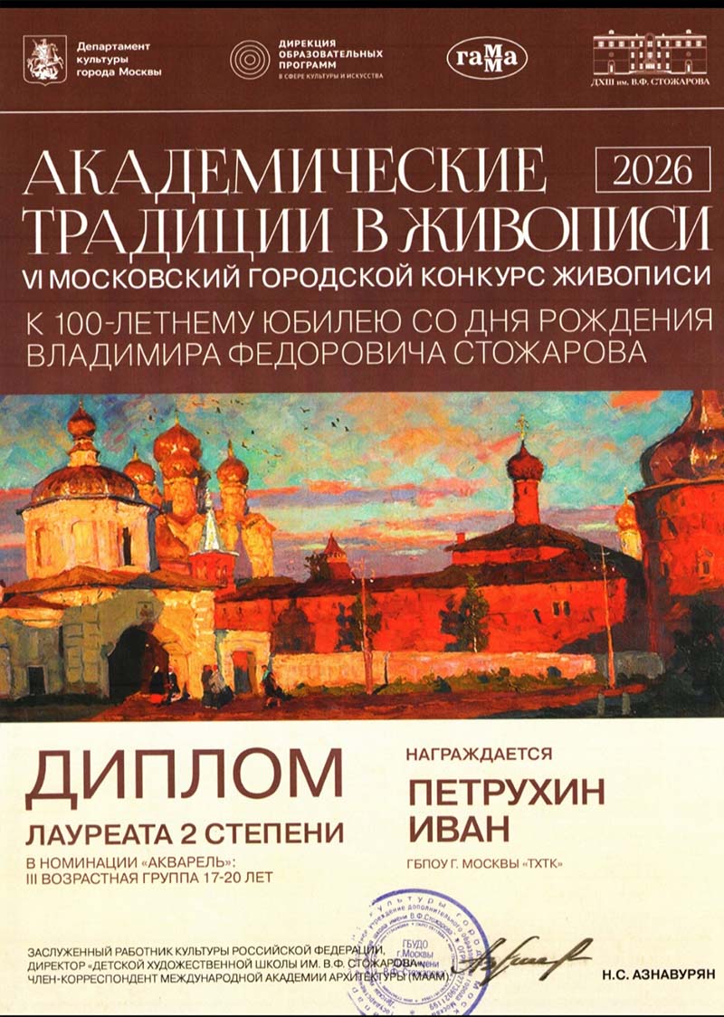 14 апреля 2026 года были вручены грамоты победителям VI Московского конкурса живописи к 100 летнему юбилею со дня рождения Владимира Фёдоровича Стожарова «Академические традиции в живописи». Церемония торжественного вручения грамот проходила в Галерее искусств Зураба Церетели в зале «Яблоко». Поздравляем студентов колледжа, показавшим высокие результаты на Городском конкурсе: Лауреатов 2 степени Ивана Петрухина и Марию Гафарову, Лауреата 3 степени Анну Макарову!. Выражаем особую благодарность преподавателю колледжа Рыбкиной Марине Ивановне, отлично подготовившей студентов к конкурсу! Ждём новых Побед!