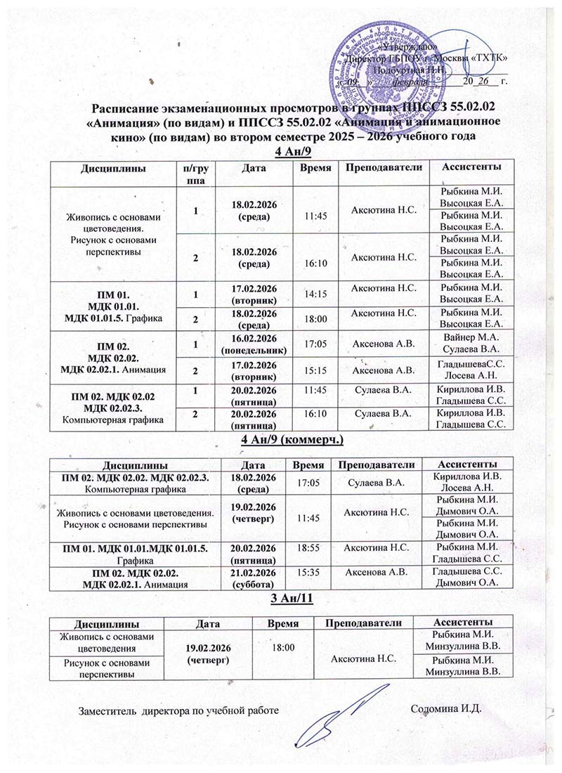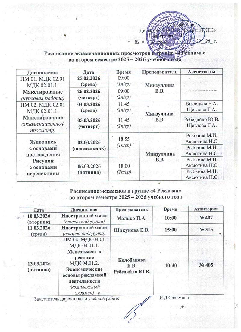 Расписание экзаменациооных просмотров и экзаменов во II полугодии 2025-2026 учебного года в руппах: 4Реклама