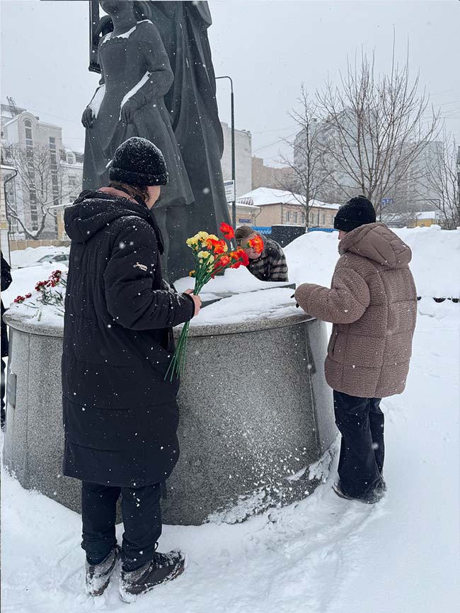12 февраля 2023 года студенты колледжа возложили цветы к мемориалу Великой Отечественной войны «Братская Могила» в районе Митино. В конце 1941 года фашисты подошли очень близко к Москве, и фронт проходил всего в 15 километрах от Митино! Зенитчики сражались с вражескими танками в районе Волоколамского шоссе (оборону держала 9-я гвардейская дивизия генерала А.П. Белобородова). Битва была очень кровопролитной, погибло много людей. А в 1967 году комсомольцы московского монтажного управления № 5 установили памятный знак из 4 сходящихся к центру плит, символизирующих склоненные знамена. Так получился этот мемориал. На сегодняшний момент известны имена и воинские звания 353 солдат и офицеров, захороненных в этой могиле.