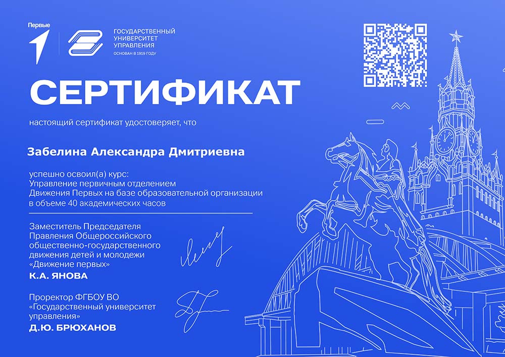 Поздравляем Председателя РДДМ – «ДВИЖЕНИЕ ПЕРВЫХ» ГБПОУ г. Москвы «ТХТК» (Руководитель заместитель директора по УВР Речкина Л.Я.) Забелину Александру Дмитриевну, которая стала финалистом конкурса «Лидер будущего» регионального отделения Российского движения детей и молодёжи «Движение первых» города Москвы 2024 года.