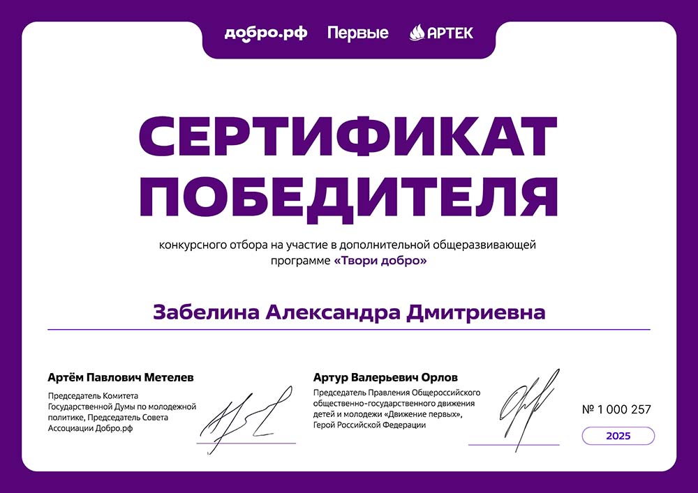 В 2025 году Председатель РДДМ – «ДВИЖЕНИЕ ПЕРВЫХ» ГБПОУ г. Москвы «ТХТК» Забелина Александра Дмитриевна приняла активное участие во многих городских конкурсах и мероприятиях, получила сертификаты, грамоты и дипломы: полуфиналиста конкурса треков для студента Всероссийского конкурса «Большая перемена», участника Первой Всемирной общественной Ассамблеи «Новый мир осознанного единства», победителя конкурсного отбора на участие в дополнительной общеразвивающей программе «Твори добро» и др.