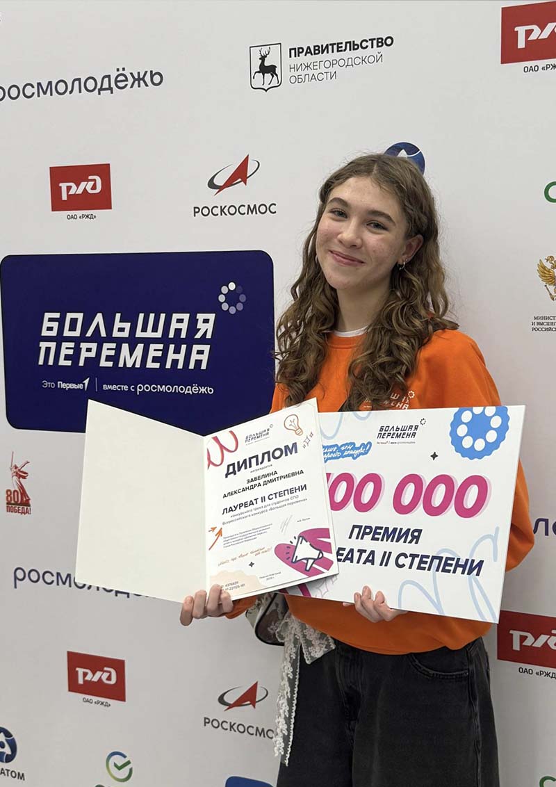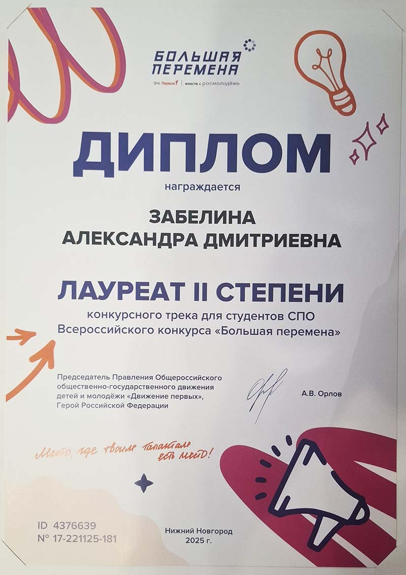 С 17 по 21 ноября 2025 года в Нижнем Новгороде проходил финал Всероссийского конкурса «Большая перемена». Финалистов и гостей приветствовал Президент России Владимир Путин. Общее количество участников в этом году составило 1 190 000 человек, финалистами среди СПО стали 600 из 63 регионов России. Поздравляем студентку нашего колледжа - председателя РДДМ – «ДВИЖЕНИЕ ПЕРВЫХ» ГБПОУ г. Москвы «ТХТК» Забелину Александру Дмитриевну с огромной победой на конкурсе! Она стала Лауреатом II степени конкурсного трека для студентов СПО Всероссийскогконкурса «Большая перемена»! Конкурс проводился при поддержке Минпросвещения России. Участников ждали не только конкурсные испытания, но и насыщенная просветительская программа, в рамках которой эксперты в области образования, просвещения, науки, медиа и креативных индустрий провели тематические активности. Единая тема всех конкурсных этапов шестого сезона – «От мечты к свершениям». В этом году у ребят в рамках конкурса появилась возможность рассказать о своей самой заветной мечте, вместе с командой сделать первый шаг к ее реализации, а также поразмышлять о том, как помогать людям из разных стран исполнять их мечты. Отметим, что флагманский проект Движения Первых «Большая перемена» – самый масштабный конкурс для детей и подростков в России. Мы от всей души поздравляем Александру с этим фантастическим результатом и желаем ей дальнейших успехов, новых идей и покорения ещё больших вершин!