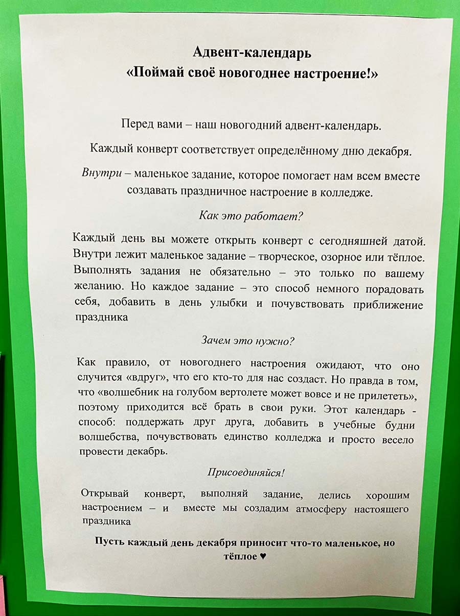 10 декабря 2025 года педагог-психолог Лапина Е.А. разместила в колледже адвент-календарь, содержащий в себе психолого-ориентированные заданий для подготовки к Новому году! Данный календарь направлен на развитие эмоциональной устойчивости, создание позитивного настроя и поддержку обучающихся в предновогодний период. Ежедневные задания помогают ребятам постепенно включаться в праздничную атмосферу, совмещая элементы психологической практики с творческими и мотивирующими активностями. Календарь способствует формированию чувства общности, укреплению благоприятного психологического климата и созданию уютной праздничной атмосферы в колледже.